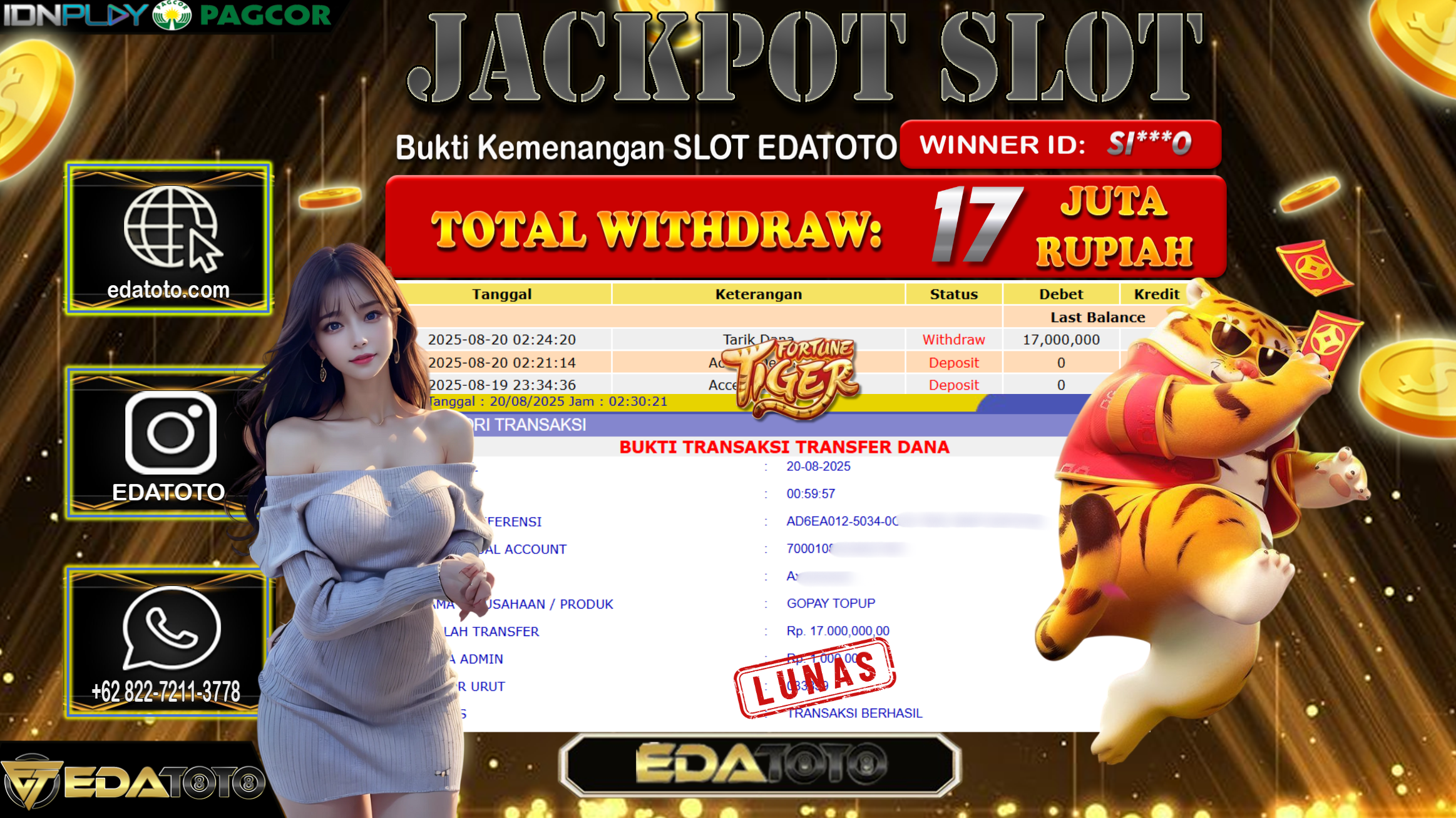 Selamat Kepada Pemilik user ID : SI***0 Hari/Tanggal : Kamus/ 21, Agustus 2025 Jackpot : Rp. 21.000.000 JT Permainan : . . .
