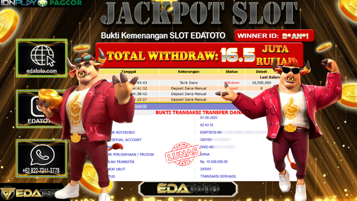 Selamat Kepada Pemilik user ID : B*AN*1 Hari/Tanggal : Jumat/ 1, Agustus 2025 Jackpot : Rp. 16.500.000 JT Permainan : . . .