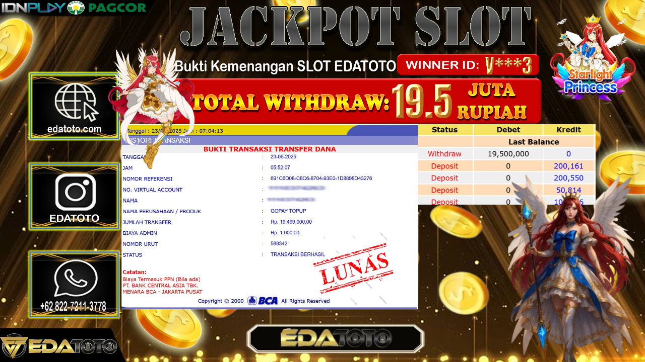 Selamat Kepada Pemilik user ID : V***3 Hari/Tanggal : Senin/ 23, Juni 2025 Jackpot : Rp. 19.500.000 JT Permainan : Starlight . . .