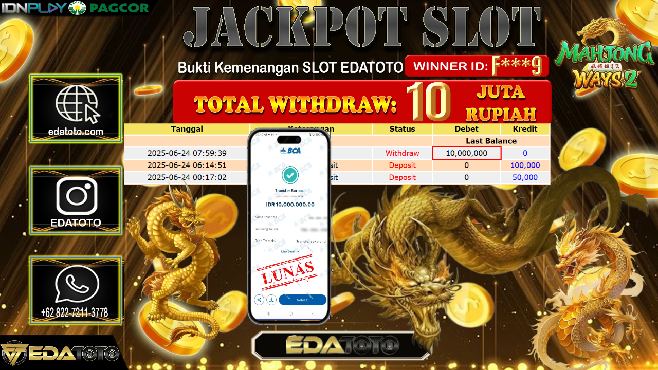Selamat Kepada Pemilik user ID : F***9 Hari/Tanggal : Selasa/ 24, Juni 2025 Jackpot : Rp. 10.000.000 JT Permainan : Mahjong . . .