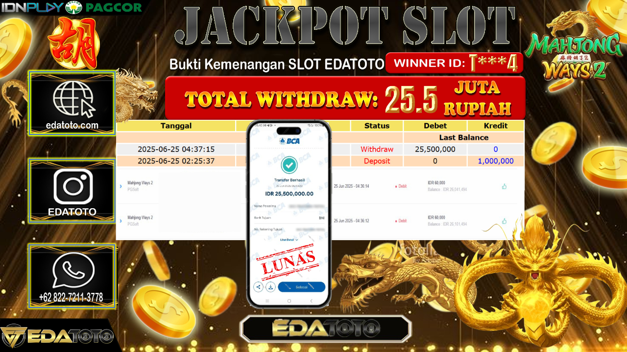 Selamat Kepada Pemilik user ID : T***4 Hari/Tanggal : Rabu/ 25, Juni 2025 Jackpot : Rp. 25.500.000 JT Permainan : Mahjong . . .