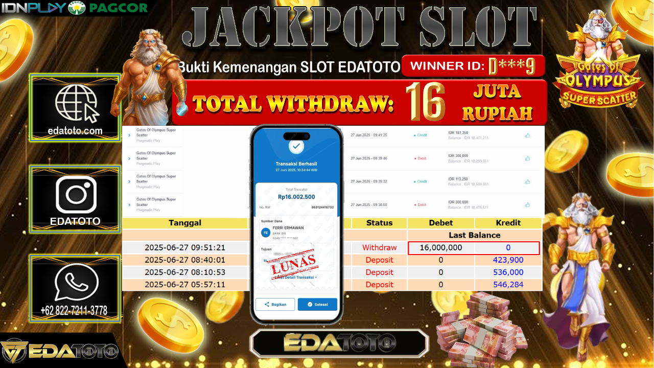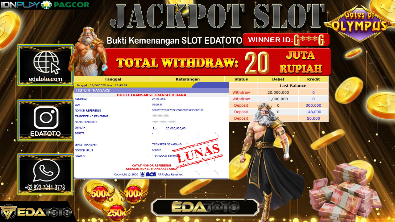 Selamat Kepada Pemilik user ID : G***6 Hari/Tanggal : Jum’at/ 27, Juni 2025 Jackpot : Rp. 20.000.000 JT Permainan : Gates . . .