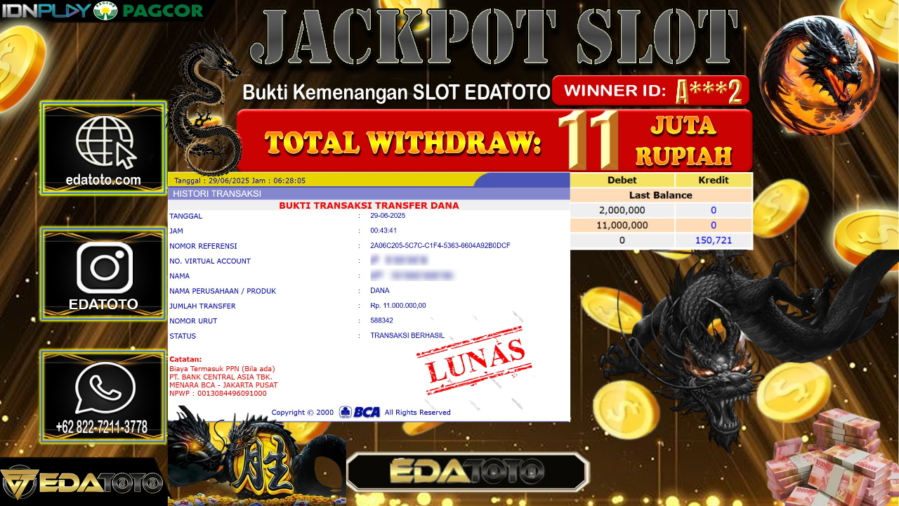 Selamat Kepada Pemilik user ID : A***2 Hari/Tanggal : Minggu/ 29, Juni 2025 Jackpot : Rp. 11.000.000 JT Permainan : mahjong . . .