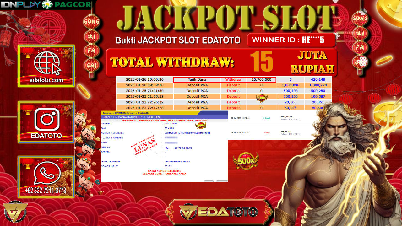 Selamat Kepada Pemilik user ID : HE****5 Hari/Tanggal : Senin / 27 , JANUARY 2025 Jackpot : Rp. 15.760.000 JT . . .