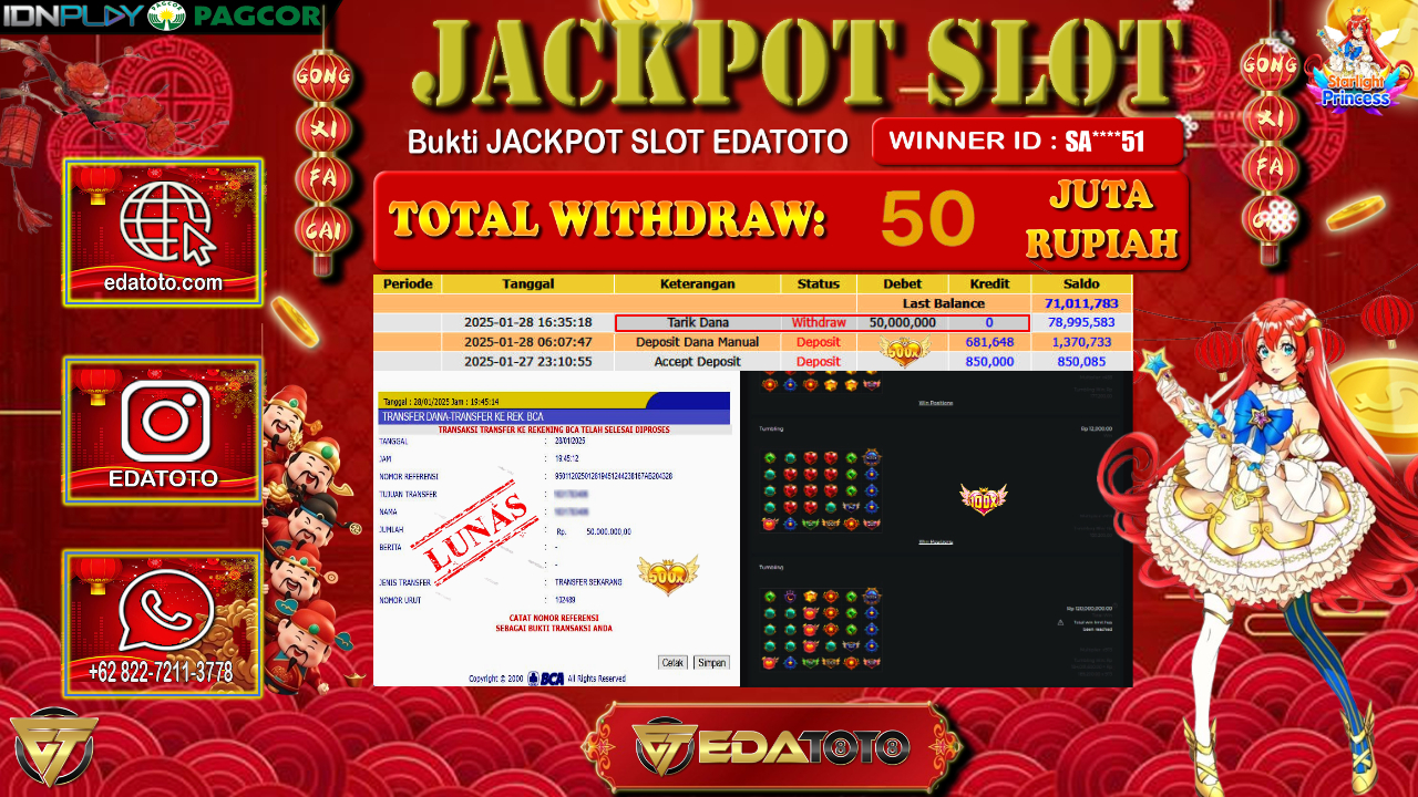 Selamat Kepada Pemilik user ID : SA****51 Hari/Tanggal : Rabu/ 29 , JANUARY 2025 Jackpot : Rp. 50.000.000 JT Permainan . . .