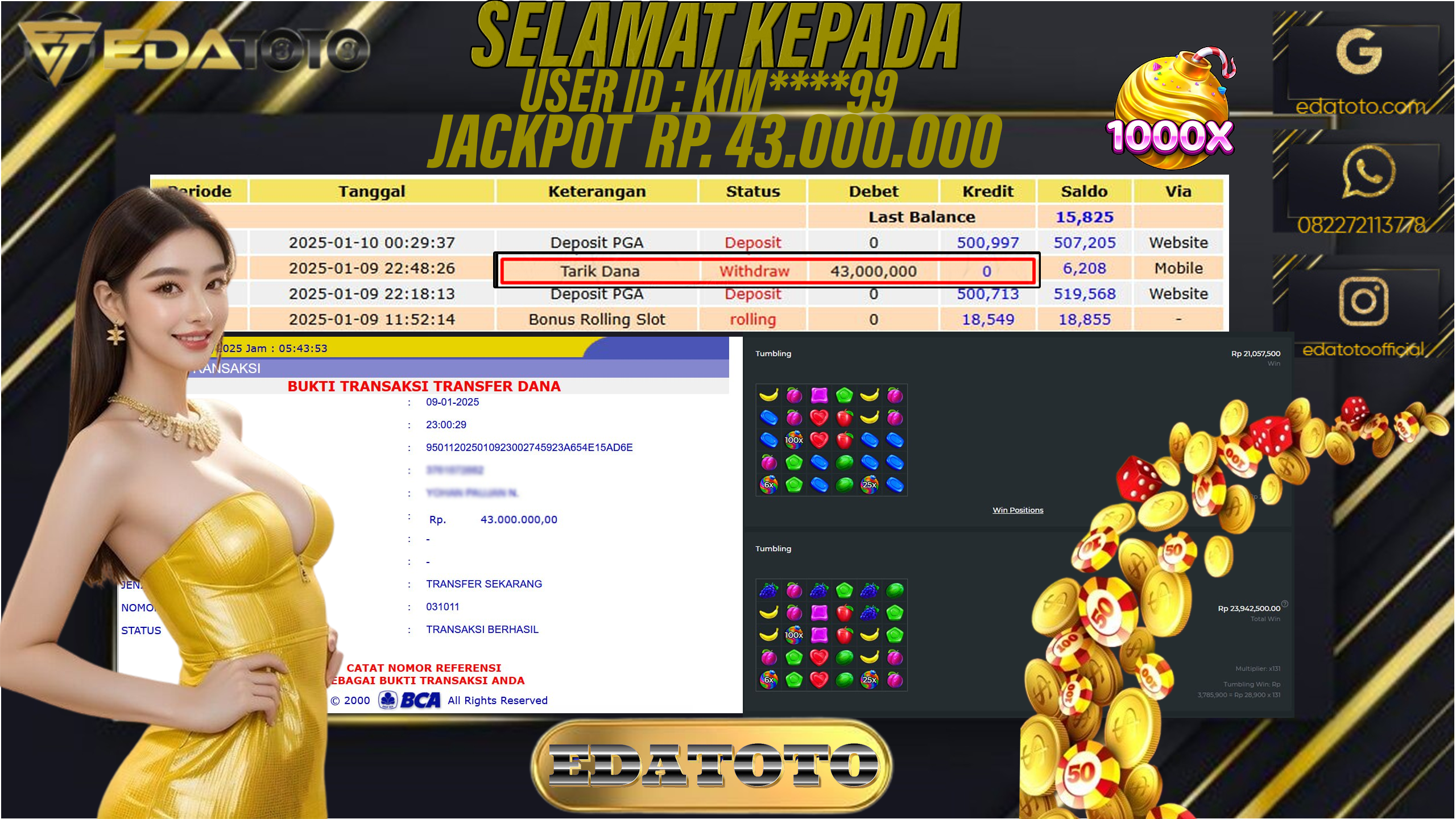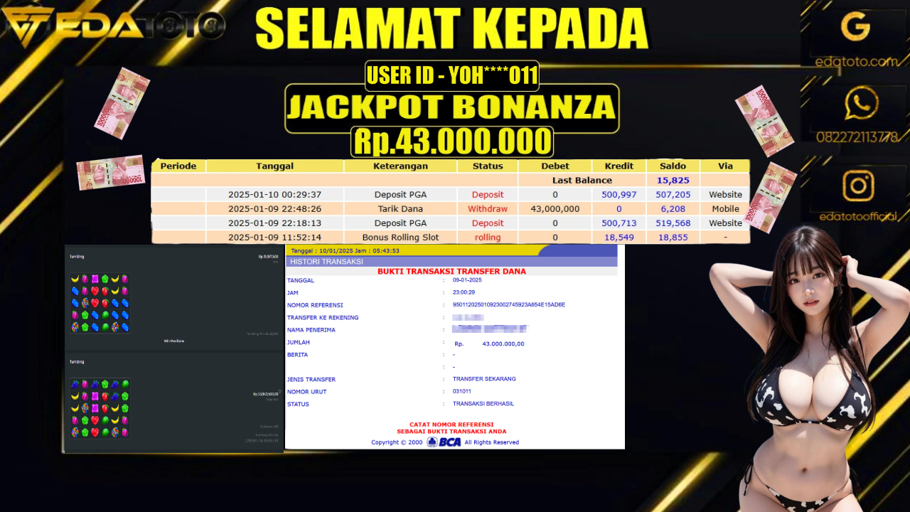 Selamat Kepada Pemilik user ID : KIM*****99 Hari/Tanggal : SABTU / 11 JANUARY 2025 Jackpot : Rp. 43.000.000 JT . . .