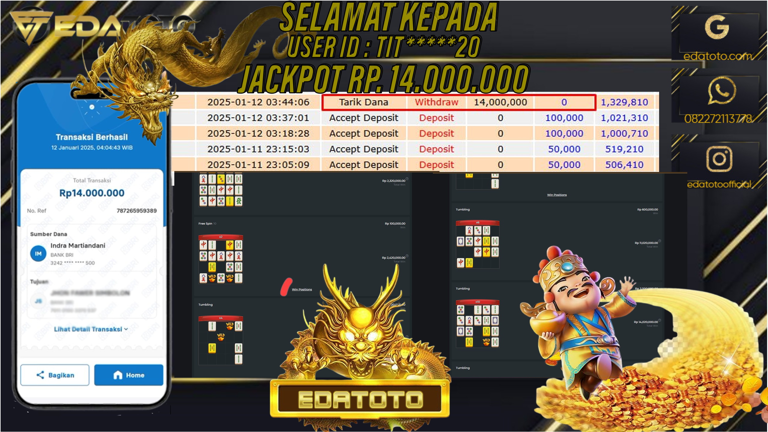 Selamat Kepada Pemilik user ID : TIT****20 Hari/Tanggal : SENIN / 13 , JANUARY 2025 Jackpot : Rp. 14.000.000 JT . . .