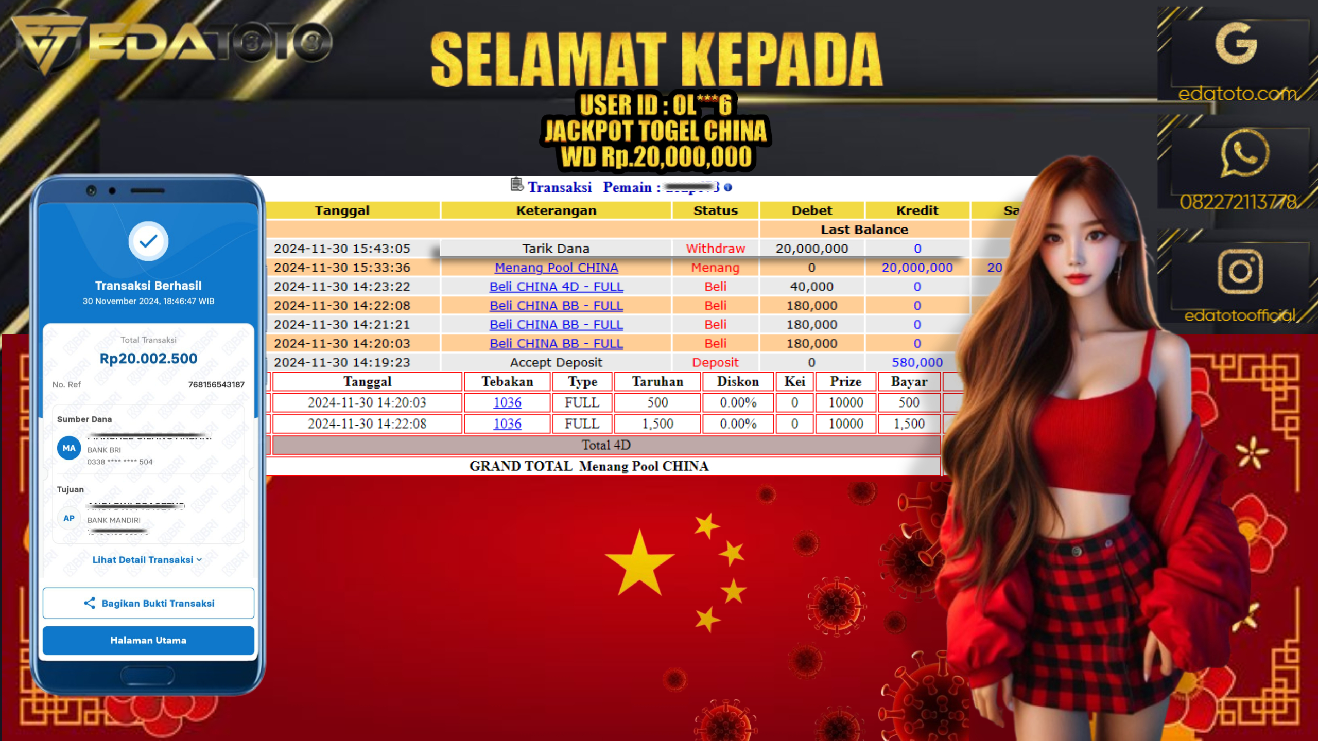 Selamat Kepada Pemilik user ID :OL***6 Hari/Tanggal : Jumat/ 30 NOVEMBER 2024 Jackpot : Rp. 20.000.000 JT ( ADMIN 2,500 . . .