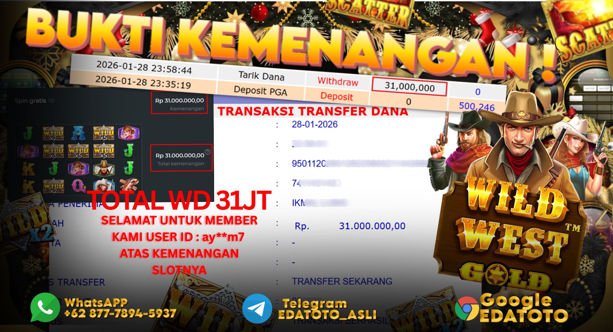 Selamat Kepada Pemilik user ID : ay**m7 Hari/Tanggal :RABU/ 28 Januari 2026 Jackpot : Rp. 31,000,000 JT Withdraw : 31,000,000 . . .