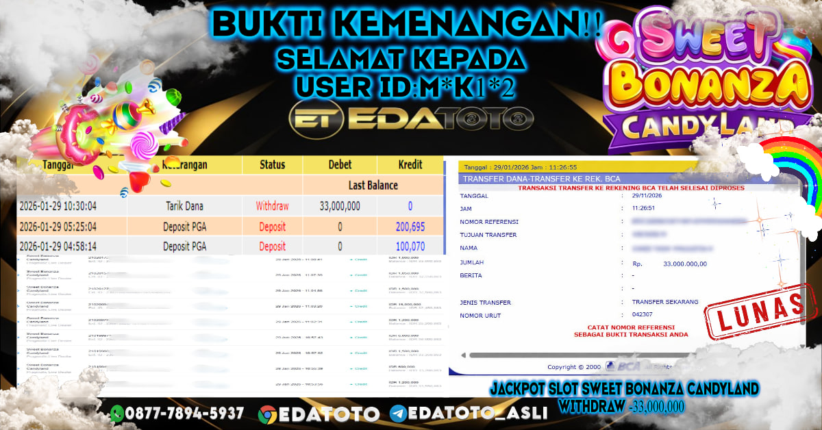 Selamat Kepada Pemilik user ID : M*K1*2 Hari/Tanggal :KAMIS/ 29 Januari 2026 Jackpot : Rp. 33,000,000 JT Withdraw : 33,000,000 . . .